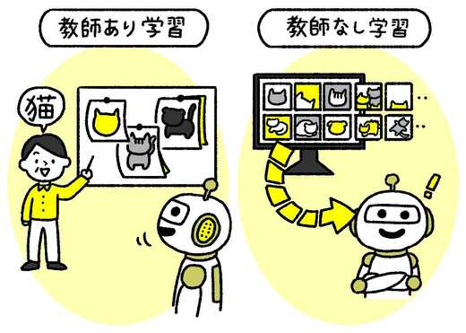 「機械」であるコンピューターが人のように「学習」することを意味する、人工知能を実現する技術の1つです。機械学習には、事前に答えを教える「教師あり学習」とAI自身が答えを探す「教師なし学習」があります。身近な例では、手書き文字の自動認識や、ネット通販の購入履歴を元にしたお勧め商品の広告の選択などに機械学習が使われています。