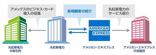 アメックスは国内屈指の法人カード会員数を抱えており、各法人会員には加盟店企業へのサービス紹介をはじめとする事業支援を行っている。一方で加盟店側でも、顧客にアメリカン・エキスプレスのビジネス・カードの導入を促すなど、加盟店とアメックス間での“相互送客”の仕組みが成り立つ点は特筆に値する。先の丸紅新電力でも、この仕組みを機能させるためにアメックスと協同で入念な準備を行ったという。
