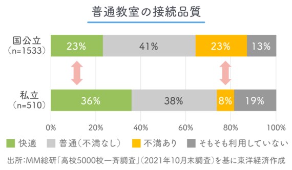 今回の調査では、普通教室で生徒用端末をインターネットにつなぐ際の接続品質についても聞いている。すると国公立は快適と回答した学校が23%、普通41%、不満23%、そもそも利用していないが13%。一方、私立は快適36%、普通38%、不満8%、そもそも利用していないが19%だった。ネット環境に不満という回答が、国公立は私立の約3倍にも上ることが明らかになった。その理由としては、「インターネットにつながりにくい」「回線速度が遅く、動画などが活用できない」という意見が多かった。