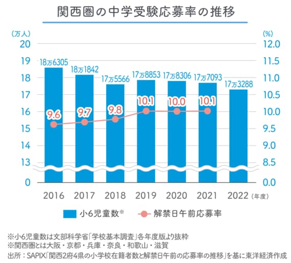 関西圏では、小学校6年生の児童のうち10%程度が私立中学校を受験するが、全体的にはどのような傾向があるのだろうか。