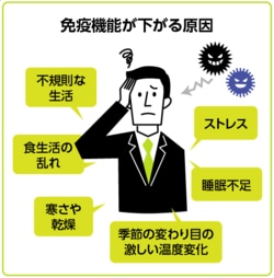 「免疫機能が大幅に低下すると病原体に感染するリスクが高まります。そのサインとなるのはまず、朝起きていつも以上に疲れを感じ、だるさが抜けていないときです。夜なかなか寝付けない、いつもより寝起きが悪いという睡眠に関する問題も、免疫機能の低下に関連しています。また、口の中が普段より渇いている状態は、粘膜の防衛機能が低下しています。このような体の変調を自覚したら、対策を考えるとよいでしょう」