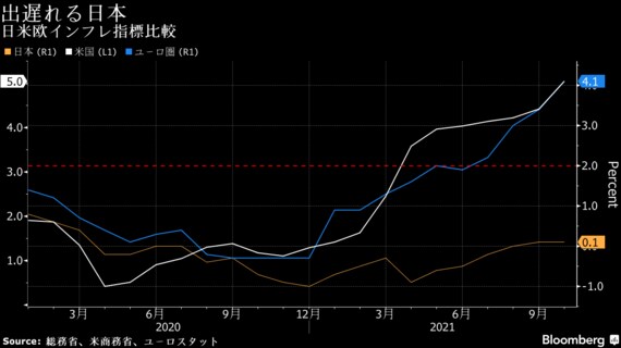 経済活動の再開を背景にインフレ懸念が台頭する米欧と対照的に、日本の消費者物価(除く生鮮食品、コアCPI)は10月に前年比0.1%上昇にとどまったが、中川氏の発言は上振れ余地が生じつつあることを示唆したものだ。円相場が1ドル=115円台と4年8カ月ぶりの安値圏で推移していることも、物価上昇圧力につながる。