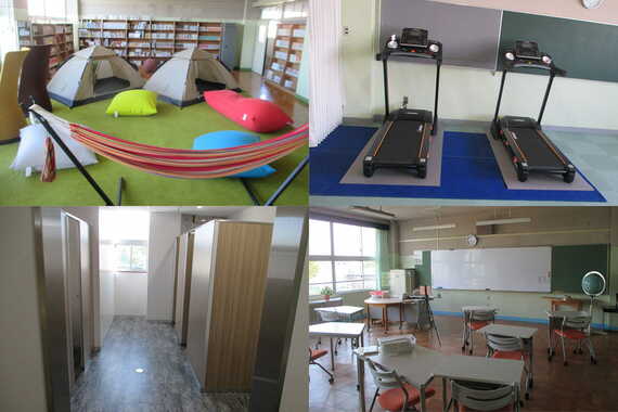 Cookingルーム(家庭科室)には生徒の希望でホームベーカリーを置いた。Musicルーム(音楽室)もピアノだけでなくドラムやギターなどいろいろな楽器があり、生徒たちは個人の演奏はもちろん、セッションも楽しんでいる。そのほか、卓球台やトレーニングマシンで体を動かしたりゲームで遊んだりできるアクティブルーム、テントやハンモックが置かれたくつろぎの図書室など、ホッとできるような空間が複数ある。