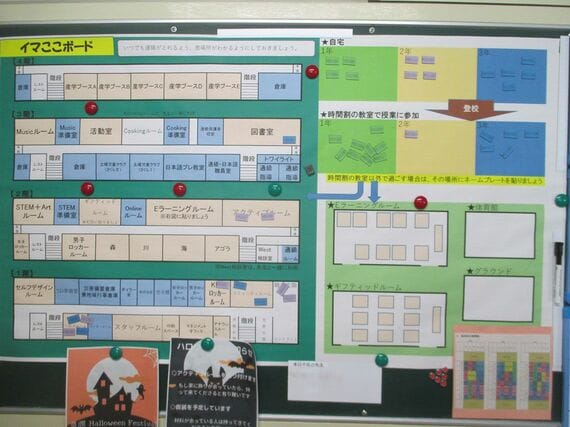 お昼ご飯は弁当で、どこで食べてもいい。一般校での年間授業時数1015時間に対して同校は770時間編成にしており、授業は4コマだ。一斉清掃はなく、最後にその日の自分を見つめ直す「クールダウン」という個別担任との短い面談を経て14時35分に下校する。家庭で学習を進めた生徒には、ほかの生徒が下校した後に「Onlineクールダウン」と称した個別の声がけを実施している。
