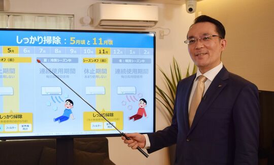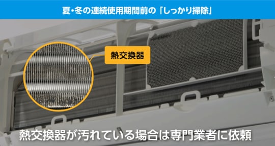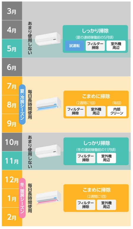 「エアコンには、毎日長時間使用する期間と、あまり使用しない期間があります。毎日長時間使用する期間は主に7〜9月と、12〜2月です。この期間は『こまめ掃除』を、それ以外の期間は、エアコンを本格的に使用し始める前の5月や11月に『しっかり掃除』を行ってください」