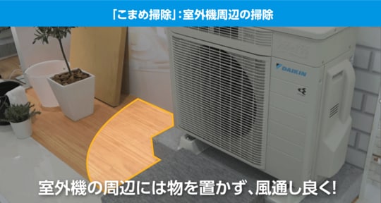 最後、室外機周辺には物を置かないようにし、またカバーで覆っている場合は外しましょう」