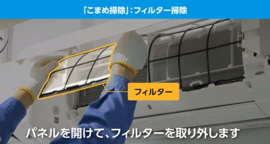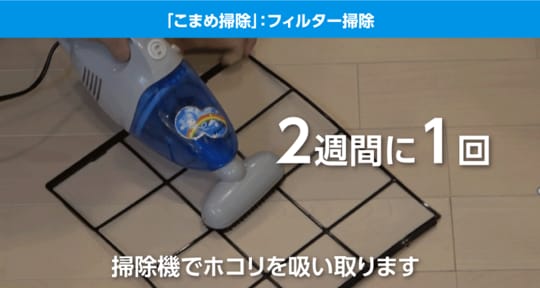 「こまめ掃除は『フィルター掃除』『内部クリーン運転(※)』『室外機周辺の掃除』の3つです。まず、フィルター掃除は、2週間に1回程度フィルターを取り出して、掃除機でホコリを吸い取るという方法で掃除してください。掃除機の吸い込み口は、ブラシ状のものがベスト。先端が鋭いものや床用のもので強く擦ると、フィルターが傷む場合もあるので、あまりおすすめしていません」