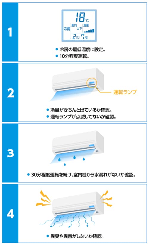 確認するポイントは、『冷房がきちんと出ているか』『運転ランプが点滅していないか』『室内機から水漏れがないか』『異臭や異音がしないかどうか』などです。夏本番になって異常が発覚すると、修理や買い替えがすぐにできず、対処まで時間を要してしまう可能性があります。試運転によって早めに異常が確認できれば、夏本番に備えて余裕を持って対処できます。