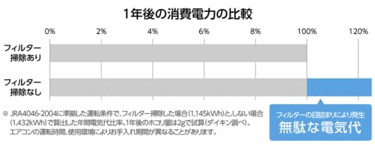 「なお、フィルターを1年間掃除しないと、目詰まりによって電気代が約25%余計にかかってしまうという検証結果もあります」(重政氏)
