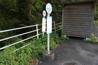 飯野川から約1時間、15時55分に神割崎入口に着いた。バスの転回場があるだけの道端だが、バス停のポールが2本並んで立っている。運転士は親切に「志津川行きに乗るなら、そちらの道から上がってきますから」と教えてくれた。奇跡的に15時57分発の戸倉線がすぐ来る。