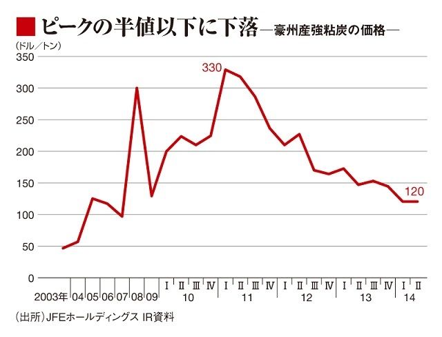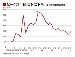 石炭は発電に使われる一般炭と、鉄を作るのに使う原料炭に分かれる。日系鉄鋼メーカーが使用する原料の指標である豪州産強粘炭の契約価格は、ピークだった2011年に1トン当たり330ドルをつけたが、2014年7~9月は同120ドルまで低下した。大和証券の五百旗頭治郎アナリストは「この価格では大半のサプライヤーは赤字だろう」と指摘する。