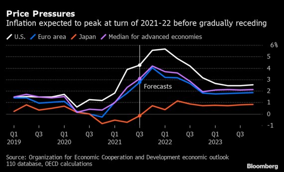 OECDは1日公表した世界経済見通しで、需要の安定と供給ボトルネックの緩和、人々の労働市場への復帰により、インフレは年末前後にピークに達するとの予測を示した。これは金融当局者に「政策上の大きな課題」を突き付けるが、当局は引き締めを急ぐべきではないと論じた。