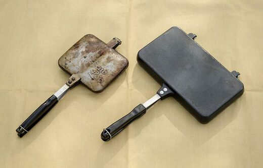 キャンプの鉄板(“間違いない”のほうね)調理道具「ホットサンドメーカー」。夜に食べ残したおかずやつまみなど、なんでもパンに挟んで焼くだけで極上の朝食に仕上げてくれるうえ、ちょっとした料理も作れてしまう魔法のような調理道具だ。