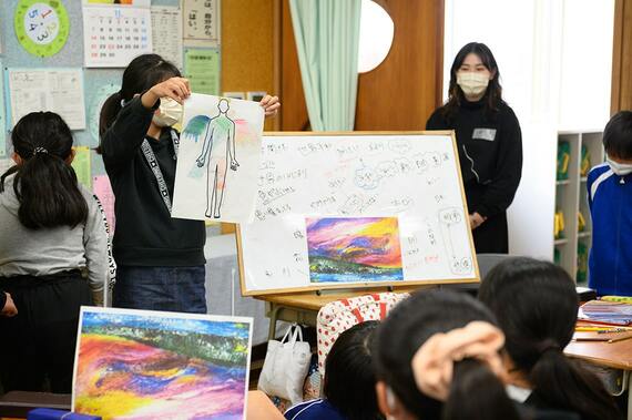 それぞれのグループの児童が、完成した絵を掲げながら、自分たちの作品について述べた。“右へ倣え”ではなく、「絵を見てどう思ったのか」「グループでどのように話し合ったのか」「デザイン画をどのように仕上げたのか」などについて、“自分の言葉”で話そうとする姿勢が印象的だった。