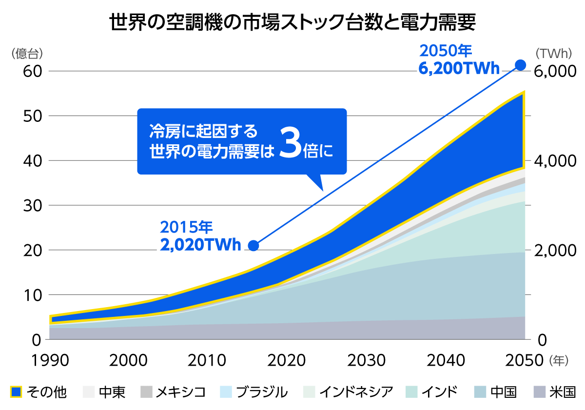 国際エネルギー機関(IEA)によると、冷房に起因する世界の電力需要は、2015年から50年までの35年間で約3倍に増加する見込みだという。しかし、開発途上国ではどうしても安さが重視されることから、現地で普及しているエアコンは、インバーター機能が搭載されておらず省エネ性能が低い「ノンインバーターエアコン」がほとんどだ。このまま予測どおりに需要が拡大していけば、地球環境へ大きな影響を与えることが懸念される。