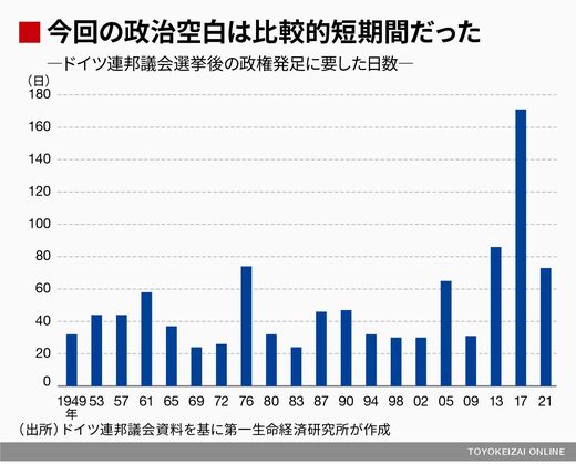 ドイツでは政策の細部にわたる連立綱領をまとめるのが通例のため、連邦議会選挙から政権発足まで時間がかかるのが一般的だが、半年近くに及んだ2017年の前回選挙と比べて、政治空白は73日と比較的短期間にとどまった。