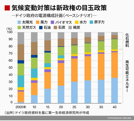 中長期的には新政権の目玉政策である気候変動対策と、エネルギーの安定供給やドイツの産業競争力とをどう両立するかが問われる。新政権は気候変動対策を大幅に強化し、石炭火力の廃止を2038年から2030年に8年前倒し、電源構成に占める太陽光発電や風力発電など再生可能エネルギーの割合を2030年までに80%に引き上げ、電気自動車や充電スタンドの普及促進などを目指している。