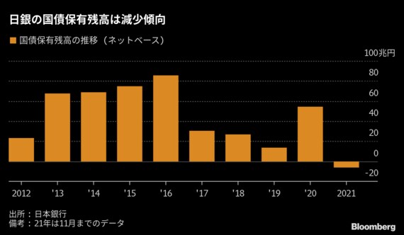 日銀は20年4月、国債買い入れについて「年間約80兆円」の保有残高増のめどを撤廃した。それ以降買い入れ額はさらに減り、11月末までの日銀のデータによれば国債保有残高は今年減少傾向にある。