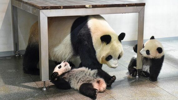 雄のシャオシャオ(暁暁)が双子の雌のレイレイ(蕾蕾)にじゃれついておしりを噛んだり、食事に夢中の母シンシン(真真)にレイレイが近寄って、シンシンに足をのせられたりと、元気いっぱいのジャイアントパンダの親子。12月23日に生後半年を迎える双子は、シンシンと一緒に2022年1月12日から公開される。東京都の小池百合子知事が12月10日の定例会見で明らかにした。