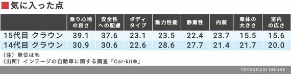 そのほかでは、「動力性能」「静粛性」「車体の大きさ」「室内の広さ」が微減している。逆説的ではあるが、これらの理由はクラウンの優れたパッケージングにあるのではないだろうか。