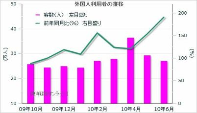 景気の底打ちとともに利用客が緩やかに回復すること自体はサプライズではないが、利用客の状況を細かく見ていくと、過去とは明らかに違うトレンドがあることに気がつく。外国人の利用客数の推移だ。