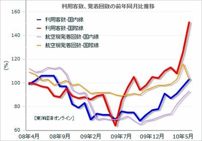 ところが、10年に入ってからこの状況が一転している。国際線の利用客は、昨年12月から増加に転じる。国内線の利用客も前年割れが続いたが、今年6月になって上向いた。
