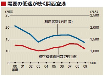そこに世界景気の悪化や、経営問題で揺れる日本航空の減便などが襲いかかる。2009年度の利用客数は1351万人と、ピーク時の00年比34%減にまで落ち込んだ。