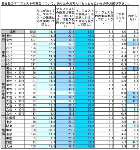 民主党としては、選挙で掲げたマニフェストをぜひ実現させたいところ。しかし1000人調査では、「必ず実現してほしい」は約1割で、「可能な範囲で」「現状に対応した政策を優先」が、計7割超。まずは今ある問題の解決を望む声が強い。