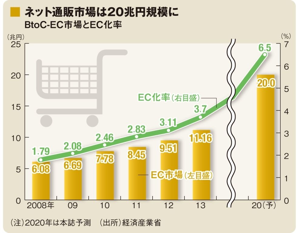 EC専業事業者や研究機関の予測を総合すると、東京オリンピックが開かれる6年後の2020年には市場規模は約20兆円台、EC化率も6~7%にまで倍増すると想定されている。