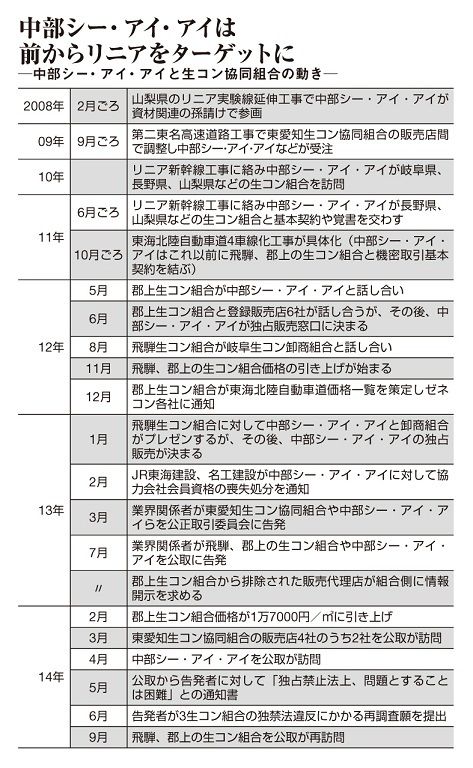 時系列で一連の取引を並べると、リニア新幹線工事に絡む契約が、かなり前から用意周到に行われていた形跡がある。しかも生コン組合を訪問する際、JR東海との関係を信用させるためなのか、JR東海商事の社員を同道させ、1~2回は訪問、契約にこぎ着けていた。それでも一部の生コン組合は拒否、または途中解約した。