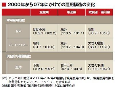 給与の下落が著しいのは、サービス業なのである。00年と07年を比較すると、卸売・小売業は108・7から99・9に、飲食店・宿泊業は、109・6から94・8に、運輸業は107・5から99・5に、それぞれ下落した。