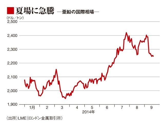 今年3月まで1トン当たり2000ドルを割り込んでいた亜鉛市況が6月から急騰し、7月に2400ドルを突破。3年ぶりの高値をつけた。この間、銅は6000ドル台後半を行ったり来たり。がぜん、亜鉛が輝き出したのだ。