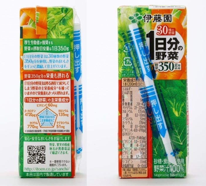 「1日分の野菜」のパッケージ側面に「栄養成分表示」がある