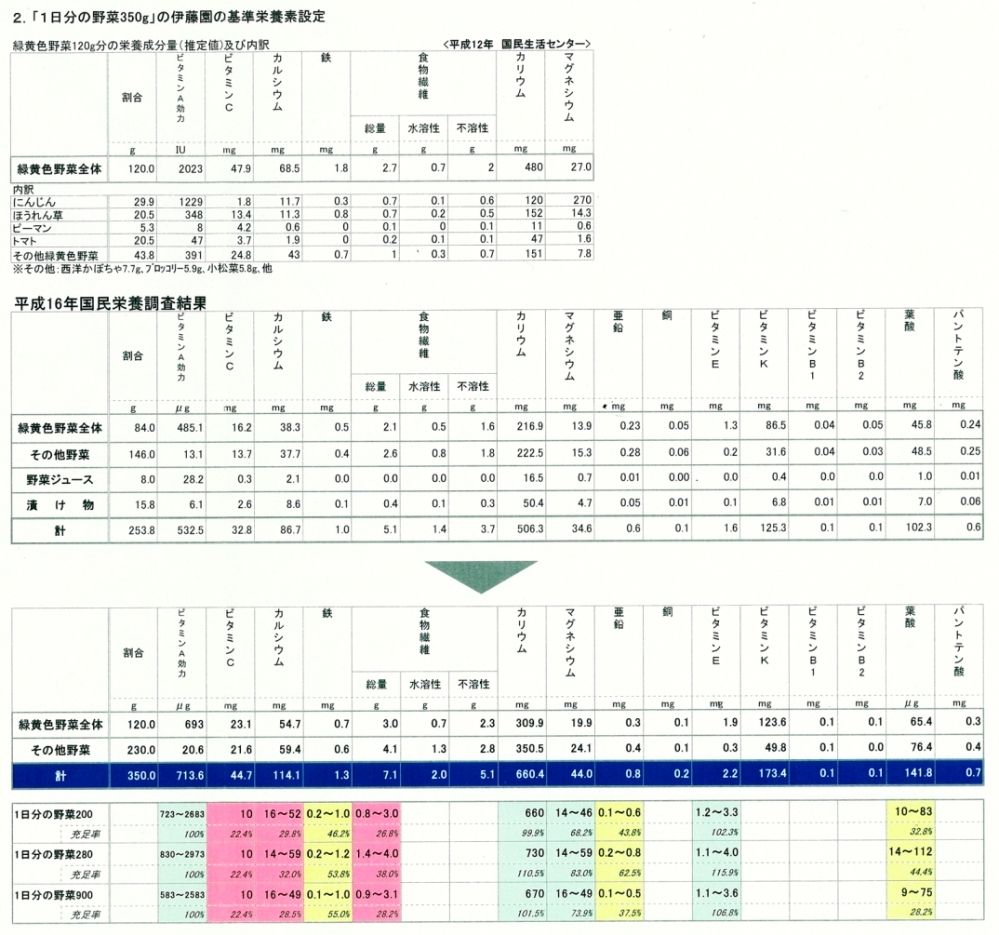 厚生労働省が毎年行っている「国民健康・栄養調査」(当時、2004年の結果)を調べたところ、緑黄色野菜は84g、その他の野菜は146g取っています。野菜350gの目標に対して230gしか取っていないというのが実態なのです。今(2012年の結果)は約250gになっていますが、足りていない。その野菜の量で摂取できる各栄養素のデータも公開されています。