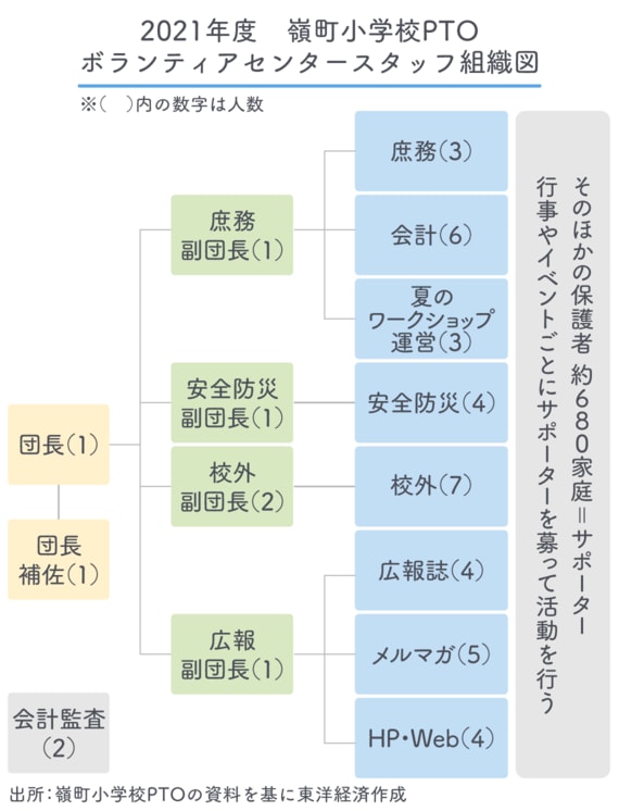 PTOで、PTA会長、副会長的な役割を担うのが団長、副団長になる。団長は1名、副団長は3名が基本だが、副団長の人数は諸事情に応じて増減することができる。21年度は団長1名、団長補佐1名、副団長が5名。副団長はそれぞれ、庶務、安全防災、校外、広報のリーダーとして位置づけられている。「次年度の団長・副団長は、現任の団長・副団長などで相談しながらやってくれそうな人、ぜひやってほしいと思う人に声がけをして、相互承認を得ながら陣容を固めていきます」と、星氏。