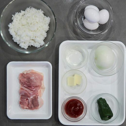 材料はシンプル。鶏肉とピーマン、タマネギを具にしたチキンライスを薄焼きたまごで包みこんでいきます。キレイに包めるの? と不安になりますが、多少不格好でも大丈夫。ある方法で最後にリカバリーできますよ!