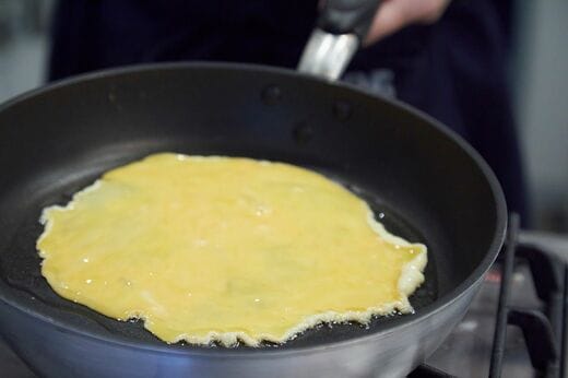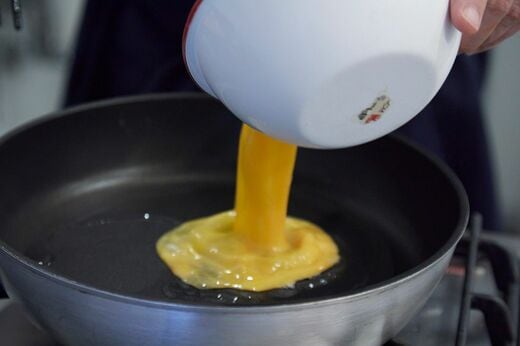 菜箸で軽くかきまぜ、こんなふうに外周がめくり上がっててきたら、ちょうどよく半熟に焼けているサイン。ここで、これ以上焼けないように火を止めてしまいましょう。