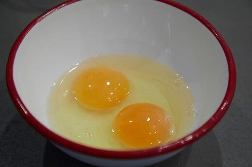いよいよたまごを焼きます。まずは1人前、たまご2個を割りほぐして塩・コショウしておきます。