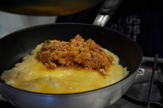 フライパンの手前にチキンライスを置きます(写真:吉澤健太)