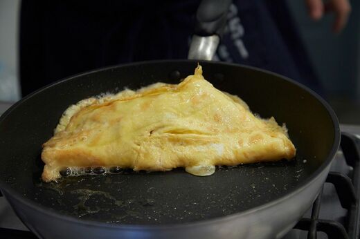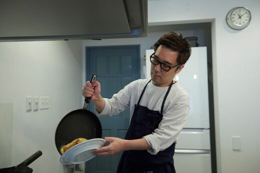 フライ返しなど使って、奥からたまごを手前にひっくり返します。チキンライスにおふとんをかけるようなイメージ(写真:吉澤健太)
