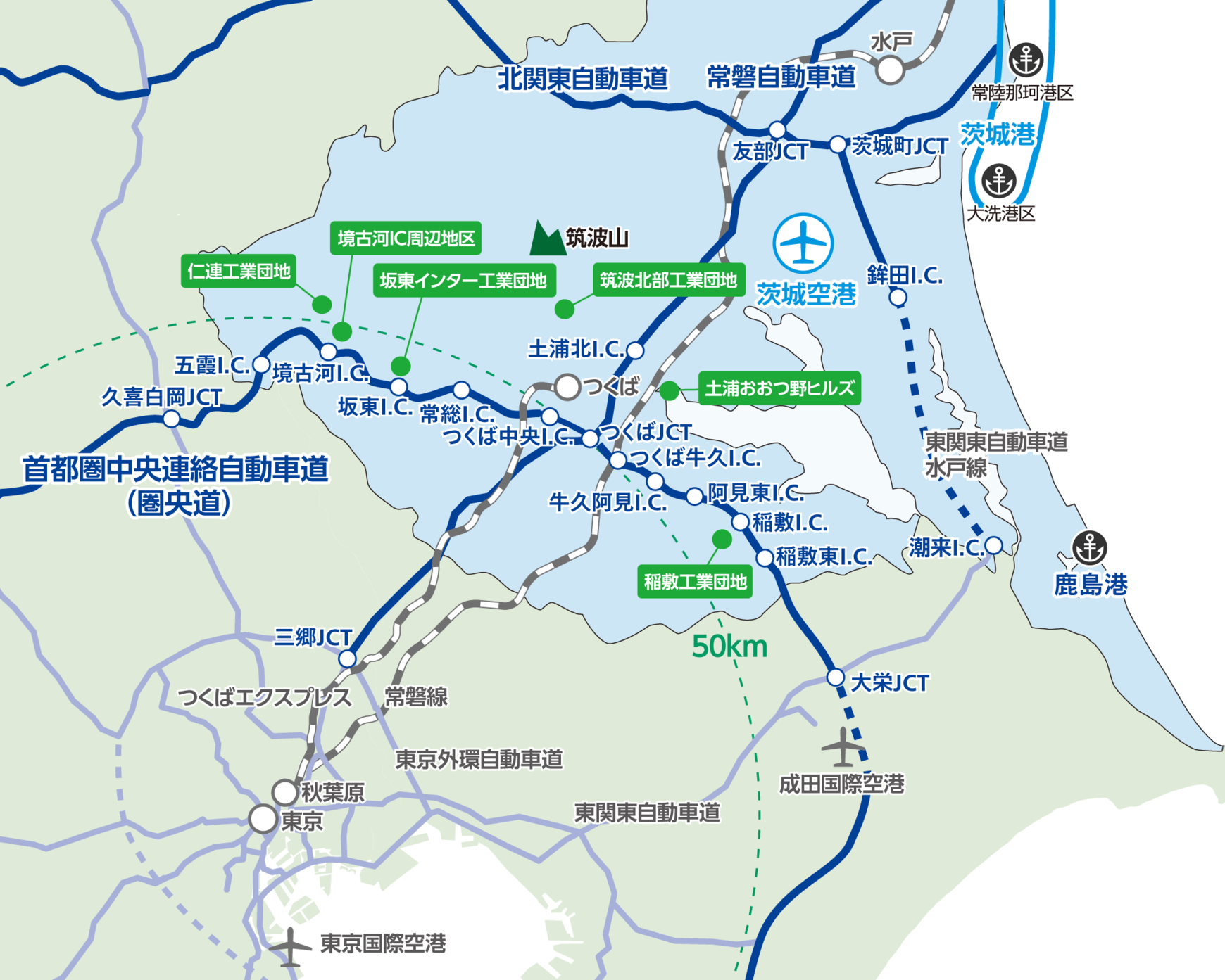 「稲敷工業団地」(稲敷市)は、成田国際空港や鹿島港に近接しており、国際物流の拠点として優れている。「仁連工業団地」(古河市)は、圏央道境古河ICまで約7キロメートルという立地で、新4号国道へのアクセスも便利だ。