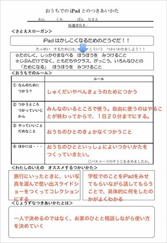 導入初日は「親子ワークショップ」を行い、iPadの初期設定や家庭でのiPadとの付き合い方について説明し、親子で話し合いながらワークシートへの記載をお願いしたという。ワークシートはコピーし、リビングなど目に留まるところに貼り、家庭でもつねに意識できるよう促した。