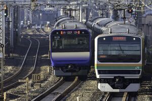 ところで、現在まで脈々と続く直通の運転系統は、じつはこの車種の関係で決まった。新前橋は211系だから、同じく211系が集中配置されている田町電車区(まさしく現在再開発中の品川の基地)が受け持つ東海道線と相性がよい。一方、宇都宮線系統のE231系は、すでにE217系で4ドア化され、車両技術面でも新世代同士となるため横須賀線と相性が合う。いざというの時の対応が容易なわけである。