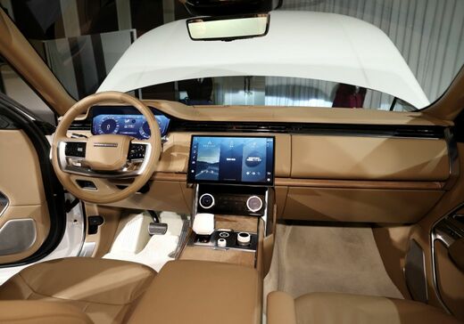 ダッシュボードはフラットな造形で視認性がよい。シート生地は本革に加えて、抗菌性や通気性を備えたウルトラファブリック、耐久性を高めたKvadrat社製ウール混紡テキスタイルなど、人工的かつサステイナビリティーに配慮した高級素材がグレードによって選択される。LWBで選択できる3列目シートは、フルサイズの寸法を備えるとランドローバーは主張する。