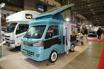 一方、アフターパーツメーカーやショップのブースでも、屋根にルーフテントを設置したデモカーが大量に展示されていた。車種もトヨタ「ハイエース」などのワンボックスカーや「アルファード」などのミニバン、スズキ「キャリイ」などの軽商用バンからダイハツ「ハイゼット トラック」といった軽トラックまで、多種多様。また、屋根の一部を改造し、停車中に上方へ展開すると就寝スペースになる「ポップアップルーフ」といった本格的装備のキャンピングカーなども展示されていた。