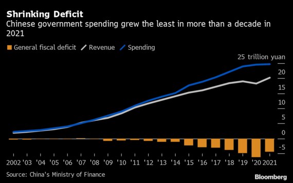 財政省の許宏才次官は25日の記者会見で、2021年の一般財政支出が前年比0.3%増え24兆6300億元(約444兆円)になったと発表。同省のデータを基にしたブルームバーグの計算によれば、伸び率は03年以来の低水準。