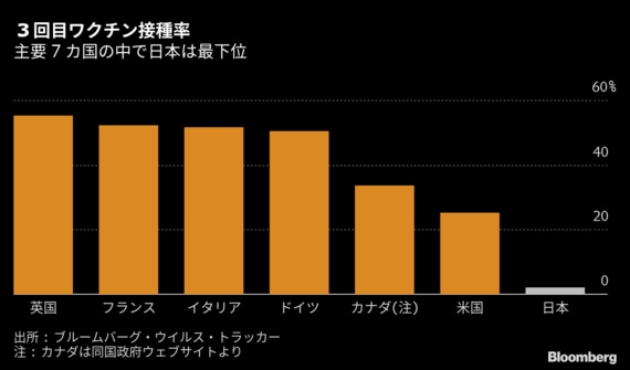 ブルームバーグが集計したデータによると、日本国内で3回目の新型コロナウイルスワクチン接種を済ませたのは人口の2.1%で、先進国の中で最も低い水準となった。足元ではオミクロン変異株が急拡大しており、1日の新規感染者数が全国で6万人を超えるなど、追加接種の早期展開が求められる状況だ。