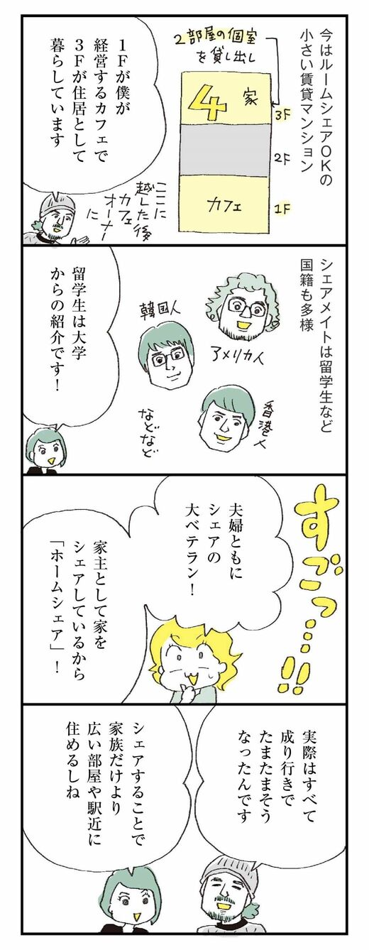 ライフ #ほしいのは「つかれない家族」 前の記事 次の記事 他人に一室を貸す「家シェア」選んだ夫婦の超発想 ワンオペ親子を救った「セーフティネット」とは 4分で読める 公開日時:2022/01/30 09:00 ハラユキ イラストレーター、コミックエッセイスト フォロー 1/7 PAGES 2/7 PAGES 3/7 PAGES 人生もシェア? 国籍も多様なシェア仲間 次ページが続きます:【ポリシーは…】 4/7 PAGES 5/7 PAGES 6/7 PAGES 7/7 PAGES