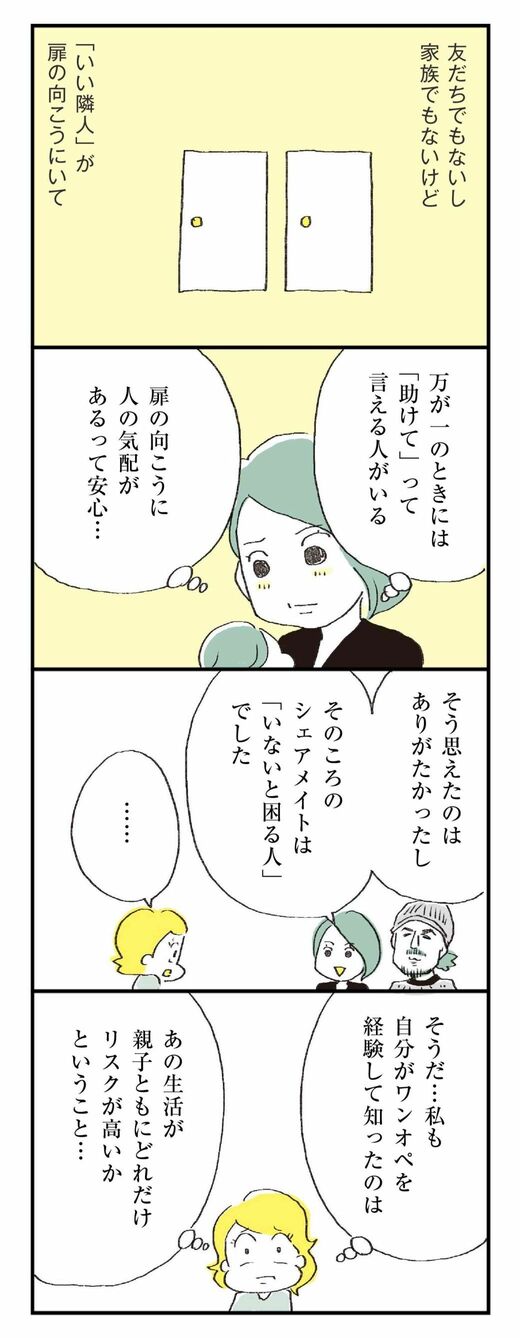 ライフ #ほしいのは「つかれない家族」 前の記事 次の記事 他人に一室を貸す「家シェア」選んだ夫婦の超発想 ワンオペ親子を救った「セーフティネット」とは 4分で読める 公開日時:2022/01/30 09:00 ハラユキ イラストレーター、コミックエッセイスト フォロー 1/7 PAGES 2/7 PAGES 3/7 PAGES 4/7 PAGES 5/7 PAGES ワンオペだけど孤独じゃない 友だちでもなく、家族でもない「隣人」たち 次ページが続きます:【結果的に…】 6/7 PAGES 7/7 PAGES