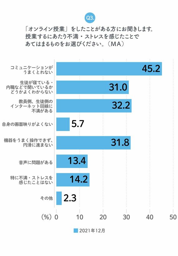 今回オンライン授業を経験した教員に不満やストレスを感じた内容を聞いた設問では、「コミュニケーションがうまくとれない」45.2%の回答が最も多く、「生徒が寝ている・内職などで聞いているかどうかよくわからない」31.0%の回答も多かった。
